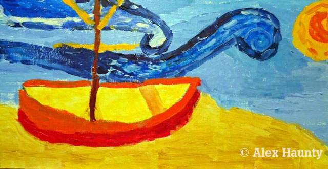 That next September, Cathy invited me to her home and I started painting. She put flowers on her table and showed me a book with Georgia O'Keeffe's paintings and I looked at this and painted my first painting that I call Flowerworks. I gave it to my mom. The next week Cathy brought out a print of Van Gogh's Starry Night. I had seen this before because my sister had a poster of it in her living room at college. Cathy put an easel on her deck overlooking Lake Mendota and I started to paint my Sailing on a Breeze. I gave this painting to my sister Melissa.